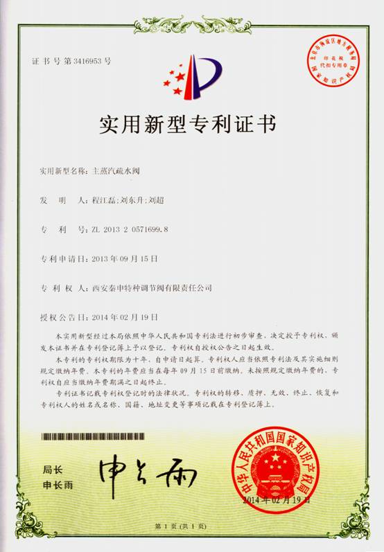 近期,我(wo)公司榮獲國(guo)家知識産權(quan)局頒發的實(shi)用新型專利(lì)證書5項,具體(tǐ)為:《用于高溫(wēn)高壓調節閥(fa)的閥♋套》、《高加(jiā)危急疏水調(diào)節閥》、《一種先(xian)導式截止閥(fa)》、《一種高加危(wei)⭕急疏水調節(jie)閥》、《主蒸汽疏(shu)水閥》。